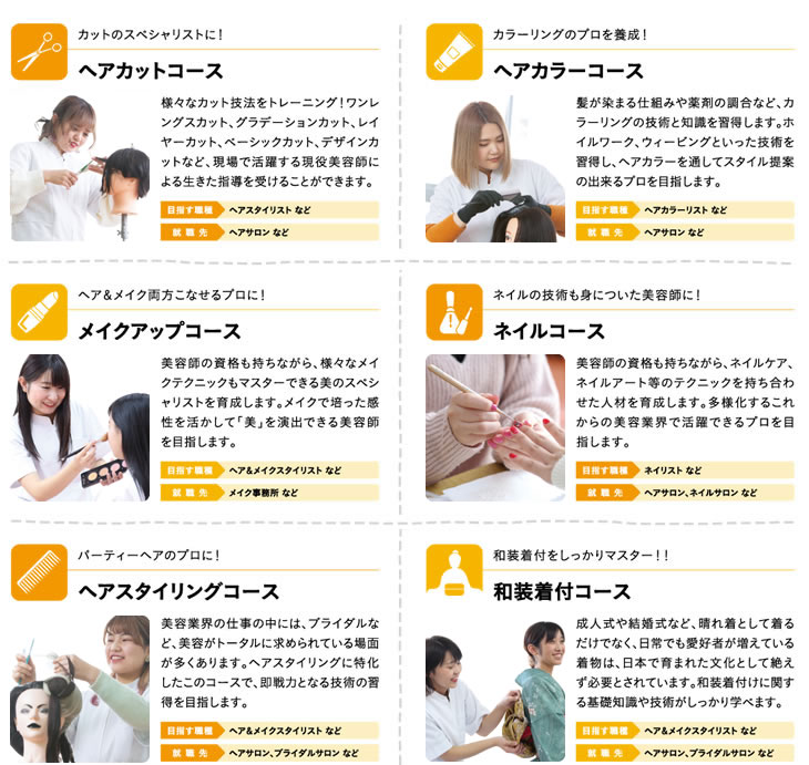 美容師資格取得のために確実な技術を身につけ、社会に出てから即戦力として期待される人材を目指します。資格取得に向けての対策やサポートが万全なので、確かな知識と技術を持った美容のスペシャリストになることができます。